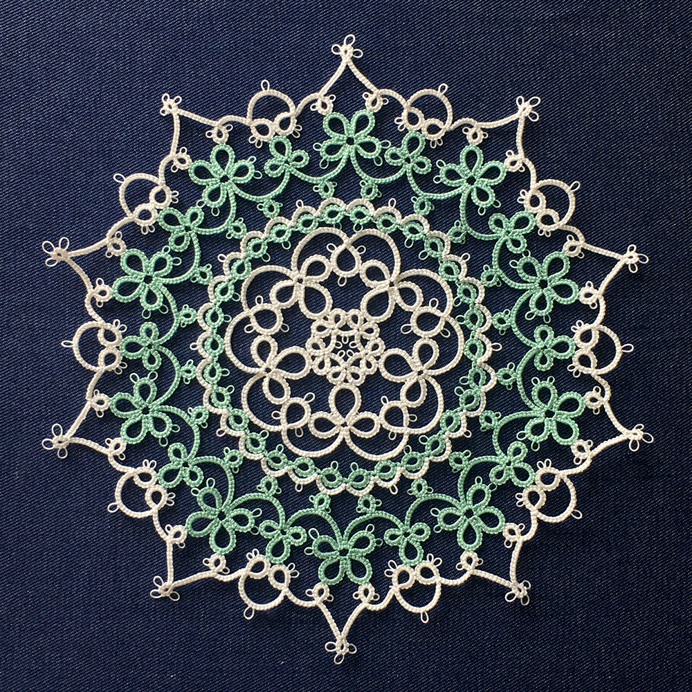 今回のドイリーの難易度はタティングに慣れてきて、リバースワークと2シャトルができるようになった方向けです。いつも満腹通り越すような編み図ばかりなので、趣向を変えて軽めのコースをご用意しました。